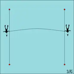 When the object of the search is large enough and of suitable form to snag a dragged line, a snag-line may be used to speed up the process. The snag-line may be used with a pair of fixed jackstays or as a distance line for a circular search. It is often a weighted line, though there may be times when this is not required. The snag-line is held taut by the diver or divers, who will then drag it along the bottom as they either follow the jackstays or swim the arc until it hooks on something. When this happens the divers fasten their snag-line ends in position by tying or clipping them to the jackstays or pegging them to the ground, and swim along the snag-line to identify the target, If it is the object of the search, they will mark it, otherwise they free the line, move it over the target, return to their ends and continue the sweep.[6][3]