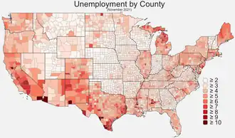 The outbreak of the COVID-19 pandemic has had a deep impact on the rate of unemployment in the United States. The World Economic Forum predicts a possible rise in the unemployment rate to 20%, a figure unseen since the Great Depression.[75] The United States Congress has passed laws to provide unemployment benefits, such as the Coronavirus Preparedness and Response Supplemental Appropriations Act, 2020, the Families First Coronavirus Response Act, and the CARES Act. On May 8, 2020, the Bureau of Labor Statistics reported that 20.5 million non-farm jobs were lost and the unemployment rate rose to 14.7 percent in April.[21] In mid-July 2020 marked the 17th week in a row that unemployment claims topped 1 million. The total unemployment claims filed since the beginning of the pandemic have moved up to 51 million, and the situation is still not optimistic since the complete reopening keeps being postponed.[76] A record 4.3 million people (2.9% of the workforce) quit their jobs in August which is the highest quit rate since the report began in late 2000.[77]