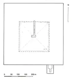 The alignment of the pyramid complex is very similar to that of the pyramid of Djedefre. It consisted of a 465 m × 420 m (1,526 ft × 1,378 ft) enclosure wall within which the mortuary temple should have been located. However, since the first layer of the pyramid was never even started, the surrounding complex was also left unfinished and there are no traces of a mortuary temple, a causeway, a valley temple or any other cultic building.[1][5][6]