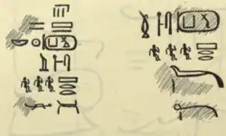 The main problem is the correct reading of the cartouche name found within at least six ink inscriptions. Whilst the lower and therefore second hieroglyphic sign is certainly a Ka-symbol, the first sign is illegible. Unfortunately the excavator, Alessandro Barsanti made no facsimiles of the inscriptions and made rather slipshod hand-drawings instead, so that the first hieroglyph remains indecipherable.[7] As a consequence there are several alternative readings of the cartouche name: Kurt Sethe reads Nebka ("His Ka is the lord"), Jean-Philippe Lauer reads Bik-Ka ("his Ka is divine"), Peter Kaplony reads Schena-Ka ("his Ka is forceful") and Gaston Maspero reads Nefer-Ka ("his Ka is beautiful/flawless").[8][9][10] Wolfhart Westendorf even proposes the depiction of a giraffe, an animal that was seen as wise and bedizen with shamanistic powers.[11]