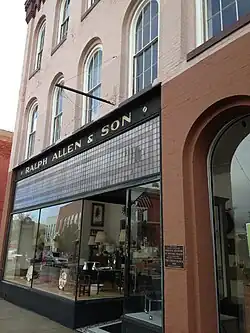 The Union Block is a three-story, brick Italianate commercial building containing two storefronts. The building measures 58 feet by 56 feet, and the roof gradually slopes from front to rear. The front facade has its original arched windows on the upper floors, and a cornice tops the facade. It is divided into two unequal storefronts - one three bays wide and one four bays wide - separated by a slightly projecting bay that originally had an open entryway leading to a stair accessing the upper floors. The storefronts were modernized in the 1950s, replacing the open entryway with a display window and combining the two storefronts into one, with a single recessed entrance.[2]