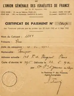 The mission of the UGIF was to represent Jews before the public authorities, particularly in matters of assistance, welfare and social reintegration. All other Jewish associations in France were dissolved and their assets donated to the UGIF and all Jews living in France were required to join the UGIF.[3] The administrators of this body mostly belonged to the French-Jewish bourgeoisie, and were appointed by the Commissariat-General for Jewish Affairs (CGQJ), the structure which had been initiated by the Vichy government at the instigation of the Nazis to reinforce antisemitic persecution. In order to finance its activities, the UGIF drew on a solidarity fund whose income was generated using the proceeds from the confiscation of Jewish property,[4] as well as contributions from its members and from funds allocated from the CGQJ.[5]