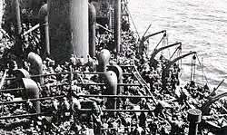 Ashantian had survived an earlier attack by U-137[18] on 26 September 1940, when, as part of Convoy OB 218, she was hit amidships on the port side by a single torpedo. It disabled the ship, killing four crew members on watch in the engine room. Both port lifeboats had been destroyed, and the 38 surviving crew members immediately abandoned ship using only the starboard 2 lifeboats, but one of them swamped, so all had to board the single remaining lifeboat. At daylight they reboarded the vessel, recovered the swamped lifeboat and sent distress signals to a circling aircraft. The commander of the Flower-class corvette HMS Gloxinia ordered the crew to leave the vessel again because a U-boat was reported in nearby Dromore Bay. On 27 September 1940, the master and crew were returned to the vessel where she was towed to Rothesay by tugs HMS Superman and HMS Seaman. She was beached in Kames Bay on 30 September 1940. In May 1941 the ship was refloated and towed to Glasgow, where she was repaired and returned to service in September 1941.