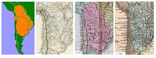 ("Article 35. The denominations successively adopted from 1810 to the present – United Provinces of the Río de la Plata and Argentine Republic, Argentine Confederation – shall henceforth be interchangeable official names to describe the Government and territory of the provinces. The phrase 'Argentine Nation' is used for the formulation and the enactment of laws.") - ^ Brué, Adrien-Hubert (1821), Carte physique et politique de l'Amérique méridionale : Physical and political map of South America (in French), Goujon, OCLC 494185362