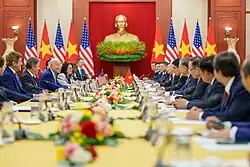 In June 2024, the United States criticized Vietnam's decision to host Russian President Vladimir Putin. U.S. embassy in Hanoi said that "no country should give Putin a platform to promote his war of aggression and otherwise allow him to normalize his atrocities."[53] A senior U.S. diplomat held talks in Vietnam and said that the trust between the two countries was at an all-time high.[54]