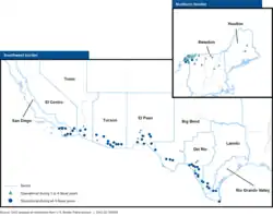 The United States Border Patrol operates 71 traffic checkpoints, including 33 permanent traffic checkpoints, near the Mexico–United States border.[1][2] The stated primary purpose of these inspection stations is to deter illegal immigration and smuggling activities. After the September 11 attacks in 2001, they took on the additional role of terrorism deterrence. These checkpoints are located between 25 and 75 miles (40 and 121 km) of the Mexico–United States border along major U.S. highways; near the southern border of the contiguous United States. Their situation at interior locations allow them to deter illegal activities that may have bypassed official border crossings along the frontier. The checkpoints are divided among nine Border Patrol sectors. There are a number of these checkpoints near the northern border of the contiguous U.S. as well (such as in the states of New York or Maine), within 100 miles (160 km) of the Canada–U.S. border.[3]