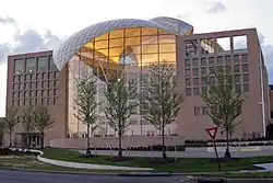 In March 2011, USIP moved into the headquarters facility built for the institute at the northwest corner of the National Mall in Washington, D.C. Designed by Moshe Safdie architects and Buro Happold, the LEED-certified building aims to serve as a symbol of America's commitment to peacebuilding. The building housed offices and staff support facilities, a library, a conference center, auditorium, classrooms, and a public education center.[60] Officials broke ground for the new headquarters in June 2008 at a ceremony that included President George W. Bush, Senate majority leader Harry Reid, and Speaker of the House Nancy Pelosi.[61] The facility sits on land owned by the US Navy.[62]