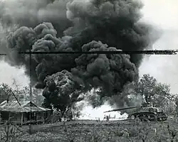 Pacific field commanders had tried field modified mechanized flame throwers early on,[5] with the Marine Corps deciding to leave further development to the Army. The Navy had an interest in flame throwing and five Navy Mark I flamethrowers arrived in Hawaii in April 1944. The Navy deemed them "unsuitable" due to their weight and turned them over to the Army's Chemical Warfare Service.[6] In May a top secret composite unit was assembled at Schofield Barracks.[7] It was led by Colonel Unmacht of the US Army Chemical Warfare Service, Central Pacific Area (CENPAC)[4][8] Col. Unmacht began the project with only the 43rd Chemical Laboratory Company. They modified the first light tank designating it a "Satan". The flame tank group was expanded with men from the 5th Marine tank battalion and 25 from the 117th CB.[7] The newly attached Seabees went over what the Army had created and concluded it was a little over engineered. They recommended reducing the number of moving parts from over a hundred to a half dozen.