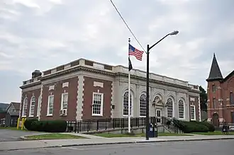 US Post Office-Herkimer is a historic post office building located at Herkimer in Herkimer County, New York, United States. It was designed and built in 1933-1934 by consulting architect Ross Edgar Sluyter for the Office of the Supervising Architect of the Treasury Department. It is a one-story, seven bay building faced with red brick laid in Flemish bond above a granite clad foundation in the Colonial Revival style. The five central bays are formed as a central pavilion and faced in terra cotta marked by Corinthian order pilasters.[2]