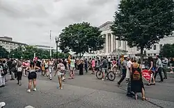 On June 24, 2022, anti-abortion and pro-abortion rights activists demonstrated outside the Supreme Court building following the decision to overturn Roe and Casey.[256] By noon, there was a major police presence around the Supreme Court building and the Capitol building, including police with riot gear, and police squad cars and SUVs. Multiple streets were barricaded by police.[257]
