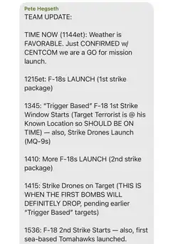 On March 15 at 11:44 a.m. EDT (UTC−4), the Hegseth-associated account shared what Goldberg described as detailed operational information regarding imminent strikes, including target information, weapons systems to be employed and attack sequencing. Goldberg stated that this message indicated strikes were to begin about 1:45 p.m. EDT.[15] When most of the chat was published by The Atlantic, it showed that Hegseth revealed information including the launch times of F-18 aircraft, MQ-9 drones and Tomahawk missiles, as well as the time when the F-18 aircraft would reach their targets, and the time when the bombs would land.[1][2]