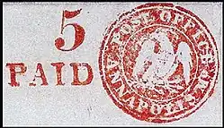 The Millbury stamp was printed from a woodcut; the New Haven and Lockport issues were handstamped; the Annapolis provisional was an indicium printed on an envelope.