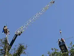 Starting at 8:00 a.m. on September 9, 2008, contractors hired by the university began constructing a 90 feet (27 m) scaffolding around the tree occupied by the tree-sitters.[60][61][62][63] At the same time the UCPD began to move cherry pickers into position around the tree.[61][62][63] The cherry pickers were topped with fabric panels to shield the contractors against anything thrown by the tree-sitters as the scaffolding was constructed.[60] While the scaffolding was under construction, UCPD Chief Victoria Harrison and Assistant Chief Mitch Celaya negotiated with the tree-sitters from a large metal basket suspended from a crane.[60][61][62][63] At noon the scaffolding reached the level of the tree-sitters platform, at which time the tree-sitters platform was dismantled and thrown to the ground to allow the scaffolding to continue.[60] At 12:42 p.m. the scaffolding was completed, with a railing around the highest platform.[60] The UCPD then mounted the scaffolding and began to remove the protesters' supplies.[60] The tree-sitters agreed to come down at 1:01 p.m. after the university agreed to involve the community in addressing future land use issues.[60][63]