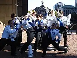 The marching band's musical program was specially arranged for the ensemble by Lutz, drawn from the classics, jazz, rock and popular idioms. Music and motion were combined through original visual design. The bands consists of instrumentalists, including guitar and bass.[1] The band does not have a color guard.
