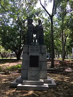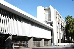 In 1936, architect Rafael Carmoega, working under the Puerto Rico Reconstruction Administration (PRRA), designed the distinctive University of Puerto Rico clock tower based on the 1924 Parsons Plan.[14] The iconic university clock tower was built in 1937 and christened as the Franklin Delano Roosevelt tower, in honor of the president and his interest in the building of the university. La Torre (as The Tower is nicknamed in Spanish) is located at the entrance of the Román Baldorioty de Castro Building.[15] Right below the tower there is a monument to the nations of the Americas portraying the coats of arms of all American states within a bronze circle, as a symbol of the Panamerican Union.[16] Under the supervision of architect Rafael Carmoega, a group of local architects designed what is known as El Cuadrángulo (The Quadrangle), a plaza-like quadrangle.[17] The campus's central quadrangle and tower were listed on the National Register of Historic Places in 1984.