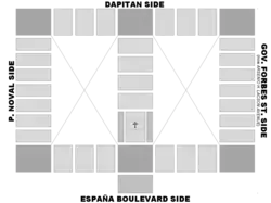 The structure is a rectangular building having a dimension of 86 meters long and 74 meters wide with two interior courtyards or patios. The most significant feature is the fact that it is actually made up of 40 separate structures independent from one another with the only opportunity provided by pre-cast stab flooring.[4] But some locations of the separations are now difficult to determine exactly because of the numerous cosmetic changes the interior of the building which has undergone over the years. According to an article written by the former dean of Faculty of Engineering, Manuel Mañosa, this is how it is divided: