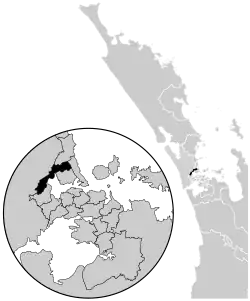 Upper Harbour covers the northwestern reaches of Waitematā Harbour. It stretches from Massey, in West Auckland, through West Harbour and Hobsonville, and across to Greenhithe and on to Glenfield and Unsworth Heights on the North Shore.[2][3]