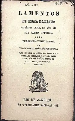 - "Lamentos de huma bahiana na triste crise, em que vio sua patria oppressa pelo despotismo constitucional da tropa auxiliadora de Portugal, para empossar no governo das armas a I. L. Madeira de Mello, por virtude da carta regia, que deo causa á guerra da carta regia, ou carnaval desastroso". Rio de Janeiro, in Typographia Nacional, 1822, in- 4º de 8 pp. num.[34][35]