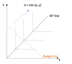 For a minimum function with goods that are perfect complements, the same steps cannot be taken to find the utility maximising bundle as it is a non differentiable function. Therefore, intuition must be used. The consumer will maximise their utility at the kink point in the highest indifference curve that intersects the budget line where x = y.[3] This is intuition, as the consumer is rational there is no point the consumer consuming more of one good and not the other good as their utility is taken at the minimum of the two ( they have no gain in utility from this and would be wasting their income). See figure 3.
