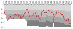 A chart showing the progress of Västerås SK through the swedish football league system. The different shades of gray represent league divisions.