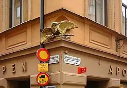 On Number 16 is the gilded raven of Apoteket Korpen ("The Raven pharmacy") founded in 1674 and located on Stortorget during 250 years. It was one of the few and one of the oldest pharmacies in Stockholm, a city with all to few doctors and frequently ravaged by epidemics, flues, and plague, pestilences thought to be cured using frogs, snakes, human fat, and pulverized mummies.[6] Today there is a preserved interior from 1924, and the pharmacy only offers factory-made medicine, except for the Christmas mustard made after its own recipe.[9]
