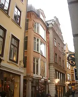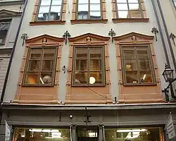 Number 70 is a medieval building but the exterior was created in the early 17th century. On the front facing Funckens Gränd are the initials of former owners: L L D L 1627, Lydert Lang and Dorotea Lang.[25] The present building on Number 72–74 is a product of the merging of two older buildings during the 20th century. In medieval times, these two buildings were separated by an alley of which remains a narrow and elongated backyard passing through the block. Various properties in the block have been merged and partitioned repeatedly over several centuries, and though virtually all traces of the medieval neighbourhood are gone, the present façade is decorated with bits and pieces of older buildings; placed in niches in the 1930s when the present shop front was built. The trader Thomas Funck owned most of the buildings in the neighbourhood in the 17th century, why he gave the alley its name. Number 76, mentioned together with the property on the opposite side of the block as "both buildings of late Funck", probably referring to one of the sons of the former. A medieval alley once passed through the building on Number 78, and the present building is partly from the early 17th century, while the shop windows and the attic were rebuilt in the 20th century.[26]
