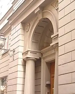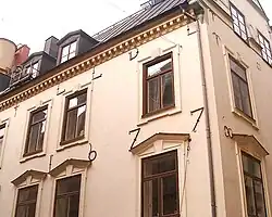 On Number 27 is the House of Palmstedt, the private home of Erik Palmstedt, the great architect of the closing 18th century. Designed in 1801, but still uncompleted by the time for his death two years later, the façade reflects the architect's late reduced style, lighter than the Custom House at Skeppsbron but tighter than the Stock Exchange at Stortorget. Still preserved are the cast iron columns and the archivolt of the portico, and the pilasters and vaults of the entrance and staircase. On the right side is a boundary plate displaying the coat of arms of the provinces Uppland and Södermanland, the message of which, UPLANDz och SUDERMANNALANDz SKILLNAD ("Uppland's and Södermanland's difference"), is often misinterpreted as indicating the delimitation of the two provinces, but is only informing of an old border between two historical dioceses.[12][16]