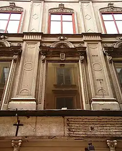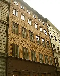 Above street level and behind the intact front, Number 7–17 are the semi-detached offices of the Riksdag. On number 7 are Roman letters displaying the year 1888 when the Neo-Renaissance sgraffito façade was created. On number 13 above the windows on the first floor, are the heads of Victor Emanuel II, Garibaldi and Cavour, obviously added by someone favourably disposed towards the Italian unification.[6] The entire block is hiding the northern end of Prästgatan, one of the few blind ends of the old town, which was historically known as Helvetesgränd ("Alley of Hell"), either because the city executioner resided in the area or because the entire neighbourhood is located north of the cathedral (e.g. in Norse folklore associated with the "Kingdom of the Dead").[7]