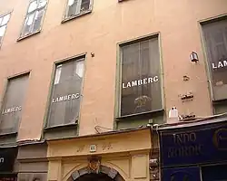Johan Hoghusen, a wine trader who immigrated from Westphalia in 1620, lived on Number 44, just as did his son and namesake who was raised to peerage and appointed county governor, and for several centuries the building continued to be leavened by the smells of liquor. The milliner's shop Lamberg, founded in 1877 by the then 21 years old Augusta Lamberg from Gothenburg, was located over the punch manufacture of J G Grönstedt in the basement, and, as the story goes, the vapours from the latter attracted customers to the former. The building was redesigned in the 18th century in the Rococo manners of J W Dinling, the rounded corners of which are still found in the courtyard and on the first floor.[12]