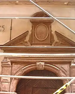 Number 52 was called Sidenhuset Pärlan ("silk house the Pearl") and the portal still features the pear-shaped pearl over the front door which was the owner's mark of the silk trader Henric Meurman. He created a small-ware shop in the 1660s, decorating the portal with fruit garlands and a bow resembling those on the House of Knights, following a common practice for burghers to copy decorations found on prominent palaces.[18]