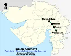 The 19035/36 Vadodara Ahmedabad Intercity Express runs from Vadodara Junction via Bajva, Anand Junction, Nadiad Junction to Maninagar.