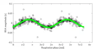 RSA magnitude estimation based on a multivariate approach based on joint analysis of ECG and respiration.[15] The green line shows the heart rate variations averaged over several breathing cycles. This clearly shows the trends that are typical of RSA.
