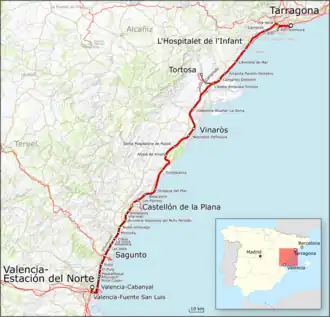 The line links Valencia to Tarragona and onward to Barcelona, following the Mediterranean coast and serving major cities and towns along the coast including Sagunto, Castellón de la Plana, Tortosa and Tarragona. In January 2018, the Valencia–Castellón section was rebuilt with a third rail to dual gauge at a cost of €355 million, allowing standard gauge AVE high-speed rail services to run from Castellón to Madrid via Valencia.[1] A new built 46·5 km cut-off section between Camp de Tarragona and Vandellòs bypassing the last remaining section of single track on the Mediterranean corridor west of Tarragona, started commercial services on January 13, 2020. The new section leads to a triangular junction with the Madrid–Barcelona high-speed rail line just west of Camp de Tarragona station.[2]