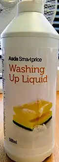 A bottle of Asda Smartprice washing up liquid. The Asda logo is reminiscent of the one used by the supermarket in the early 1980s.