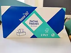 The same Facial Tissues were previously sold under the "House247" brand. The tissue box graphic and typeface for "2 ply" have been reused.