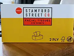 A picture of a box of Stamford Street Co Facial Tissues, demonstrating the branding used