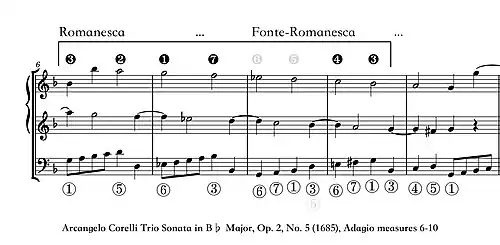 The Fonte-Romanesca is a chromatic and modulating variant of the so-called Pachelbel sequence. Its main element is a bass 6-7-1 (la-ti-do) progression, which is equivalent to the last three stages of the ascending Rule of Octave. This 6-7-1 progression is successively transposed down a third, each time to a new key, for example Bb major to G minor. Extended versions contain as many as three transpositions: e.g., Bb major–G minor–Eb major–C minor.[10]