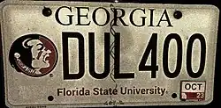 Florida State University | 2013-2020 | Screened black on reflective white; Florida State University logo screened in color at left; screened "Georgia" in black at top. | "Florida State University" screened in red at bottom | ABC123 | Replaced with updated design. | |