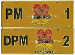 | Registration plate used motorcycles belonging to the National Government of Papua New Guinea. Introduced in 1975 to reflect independence from Australia. | ![]() |