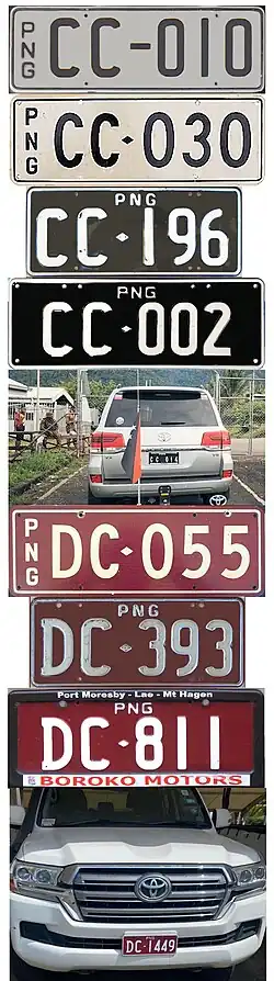 Papua New Guinea] (Papua Niugini in Tok Pisin) requires its residents to register their motor vehicles and display vehicle registration plates.[1] Motor vehicle registration is the responsibility of Motor Vehicle Insurance Limited (MVIL). Current plates are in two styles; Australian standard 372 mm × 134 mm, and use Australian stamping dies, and what is commonly referred to as "Euro Flag" style. The latter has the flag of Papua New Guinea and often a provincial flag from Morobe or Madang Province on the left. The stamping dies are German FE style.[2] Commencing in April 2025, flag style plates were no longer offered, reverting back to the standard Australian style. This commenced at LCG-000. Since the mid 1990s, plates have been issued with the first letter identifying the province of issue. As of 2025, most private and commercial motor vehicles use standard white plates with black lettering. Special number plates are issued to Consular staff, Diplomatic staff, Government owned vehicles, motorcycles, public motor vehicles (buses), taxis, trailers and to those engaged in selling or repairing vehicles. Especially in the provincial areas, many vehicles feature either just one plate, or a home-made alternative to replace a missing officially issued plate.