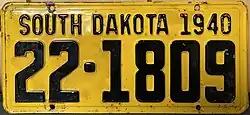 1940 | Embossed black on golden yellow; "SOUTH DAKOTA 1940" at top | none | 1-1234 10-1234 |