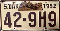 1952 | Embossed maroon on beige with border line; "S.DAK", Mount Rushmore decal and "1952" at top | none | 1-1234 1-A123 10-123 10-A12 10-1A2 10-12A |