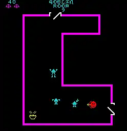 Winky is equipped with a bow and arrow and explores a dungeon with rooms and hallways. The hallways are patrolled by large, tentacled monsters named Hallmonsters, which cannot be killed, injured, or stopped in any way. Once in a room, Winky may kill monsters, avoid traps and gather treasures. If he stays in any room too long, a Hallmonster will enter the room, chase and kill him. In this way, the Hallmonsters serve the same role as "Evil Otto" in the arcade game Berzerk. The more quickly the player finishes each level, the higher their score.