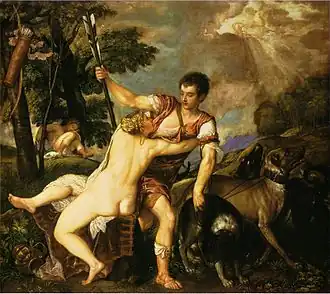 A composition of Venus and Adonis by the Venetian Renaissance artist Titian has been painted a number of times, by Titian himself, by his studio assistants and by others. In all there are some thirty versions that may date from the 16th century, the nudity of Venus undoubtedly accounting for this popularity.[1] It is unclear which of the surviving versions, if any, is the original or prime version, and a matter of debate how much involvement Titian himself had with surviving versions. There is a precise date for only one version, that in the Prado in Madrid, which is documented in correspondence between Titian and Philip II of Spain in 1554. However, this appears to be a later repetition of a composition first painted a considerable time earlier, possibly as early as the 1520s.