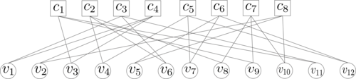 The main problem in recovery process in CS is to find the sparsest possible solution to the following under-determined system of linear equations where is the measurement matrix, is the original signal to be recovered and is the compresses known signal. When the matrix is sparse, one can represent this matrix by a bipartite graph for better understanding.[2][3][4][5] is the set of variable nodes in which represents the set of elements of and also is the set of check nodes corresponding to the set of elements of . Besides, there is an edge between and if the corresponding elements in is non-zero, i.e. . Moreover, the weight of the edge .[6] Here is an example of a binary sparse measurement matrix where the weights of the edges are either zero or one.