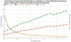PCB via current capacity chart showing 1 mil plating via current capacity & resistance versus diameter on a 1.6 mm PCB.