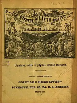 The first issue was published on 10 February 1886 in Plymouth, Pennsylvania by two Lithuanian businessmen Juozas Paukštys, owner of several grocery stores, and Antanas Pajaujis, owner of an inn and a small bank.[2] They each invested $1,000 (equivalent to $34,996 in 2024) in hopes of a profit, but Pajaujis left within a few months.[3] Initially, the newspaper advocated Catholic ideas and unity among Polish and Lithuanian immigrants in the historic tradition of the old Polish–Lithuanian Commonwealth (cf. Polish-Lithuanian identity).[2] It was a response to anti-clergy and anti-Polish Lietuviškasis balsas published by Jonas Šliūpas in New York.[4] Vienybė lietuvninkų was the official newspaper of the Lithuanian Alliance of America (Lithuanian: Susivienijimas lietuvių Amerikoje or SLA).[5] Its first editor was Domininkas Tomas Bačkauskas, who previously worked as an assistant editor of Polish newspaper Ojczyzna in Buffalo, New York.[6] Bačkauskas established a section of humor and satire that became very popular and the newspaper had about a thousand subscribers[7] and up to 4,000 total readers.[8] After a conflict with Paukštys, Bačkauskas resigned in April 1888 and established his own newspaper Saulė in Mahanoy City, Pennsylvania.[5] Bačkauskas was replaced by Antanas Turskis.[9]