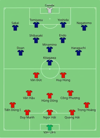 Vietnam came to the tournament with a team mostly constituted of players with little experience in international competitions. The team had a positive performance in the opening match, losing 2–4 to title contender Japan and leading 2–1 at one point during the game. However, Vietnam then lost 0–1 to direct competitor Indonesia and was soon eliminated from the group stage, marking their first defeat to Indonesia after 7 years.[79][80] In the final group stage game against Iraq, Vietnam had a good start while leading 1–0 after the first half, but the team soon fell into a disadvantage position after Khuất Văn Khang was sent off. Iraq quickly led 2–1 before Nguyễn Quang Hải equalized in the 89th minute. In the last minute of the game, Iraq was awarded a penalty and converted it, ending the match as 2–3 lost for Vietnam, forcing them to leave the tournament with 0 points.[81]