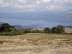 Villa Pehuenia sprawls over about 5 kilometres (3.1 mi) of the northern shore of Lake Aluminé, but is concentrated on two narrow peninsulas extending out into the lake. Rising near the village is the Batea Mahuida volcano which reaches a maximum elevation of 1,948 metres (6,391 ft) about 8 kilometres (5.0 mi) north of the Villa Pehuenia. A small ski resort is operated on the slopes of the volcano by the Puel people.[4]