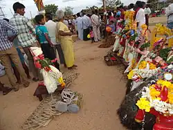 The sacrifice takes place near the end of the village festival. The animal is doused with water, and if it shivers, it is deemed to be possessed by the deity. Then, the animal is led to the shrine, and is restrained. One man takes an aruval or other sword and beheads the animal, which is then tossed aside to twitch and bleed out. For fowl, the head can be ripped off or the neck be broken without the use of a weapon. The head itself is placed in front of the deity with a foreleg in its mouth. It is believed that in this position the animal represents a demon, and by giving the demon to the deity it will be able to unite with her and become one again. Thus the villagers have done their duty.[2][3][4] The meat is then taken and is used to make a prasada, which is then offered to the deity. Afterwards, it is eaten by the devotees. It was usually the Dalits who got the meat from the buffalo sacrifice since only they would eat buffalo meat. At other times, however, anyone can walk up to the deity and make a sacrifice to them, potentially to ease some personal trouble such as a sick child or obtaining bad luck. The Muthumariamman temple in the Nilgiris was once the place where people swore solemn vows. This was sometimes used by the judicial system in the region during British times, and it was common for witnesses to make a vow of truth and make a sacrifice to Muthumariamman in the presence of a court official, so that all would know they spoke the truth.[7]